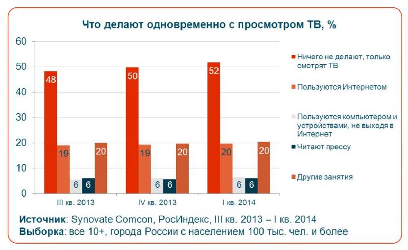 Все больше россиян не обращают внимания на другие медиа во время просмотра телевизора. В I квартале 2014 года доля зрителей, которые во время просмотра ТВ сосредоточены только на телесмотрении, возросла до 52%, тогда как в III квартале 2013 года она равнялась 48%, свидетельствуют данные исследования РосИндекс компании Synovate Comcon.