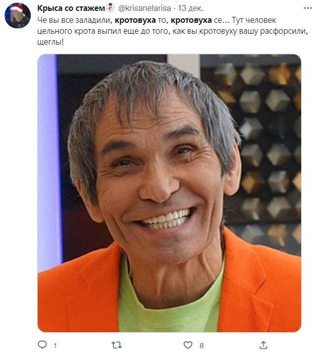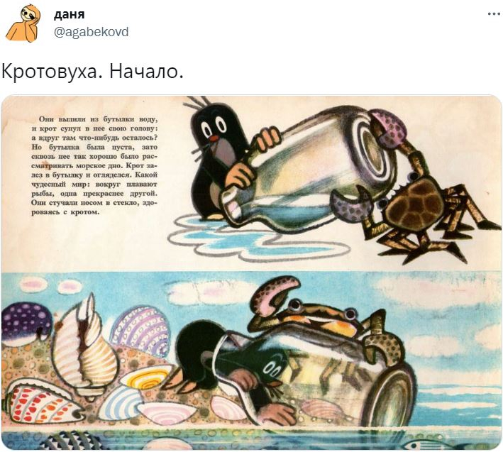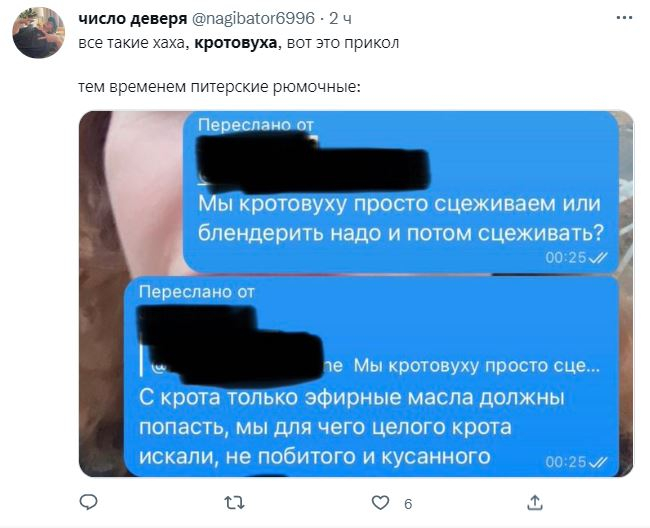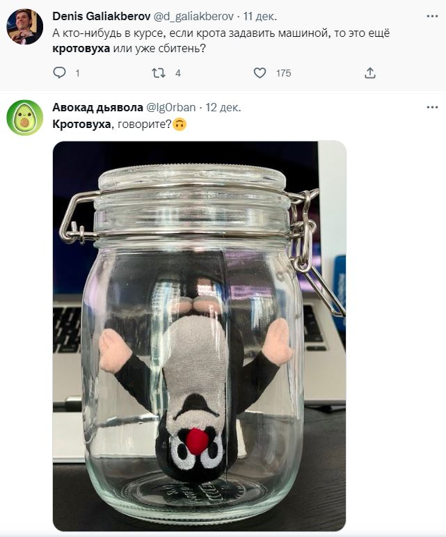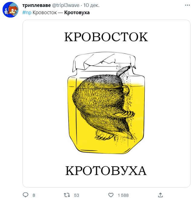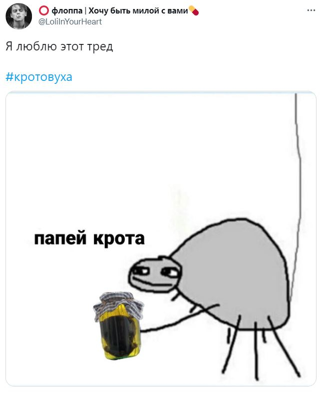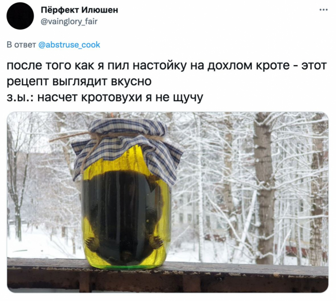 В интернете уже неделю не утихает обсуждение кротовухи — спиртовой настойки на мёртвом кроте. Всё началось с поста в Twitter со средневековым рецептом напитка из петуха, ответом на который стала публикация от пользователя с ником Пёрфект Илюшен. Он опубликовал фото банки с жидкостью жёлтого цвета и плавающей в ней тушкой крота. В последующих публикациях пользователь вкратце рассказал, как готовят такой «напиток» и при каких обстоятельствах ему удалось его попробовать.