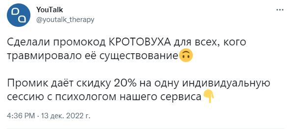 Бренды не особенно активно отреагировали на мем ситуативными активациями и креативом, однако сервис психологических консультаций YouTalk опубликовал пост в Twitter с промокодом на скидку на один сеанс «для всех, кого травмировало существование кротовухи».
