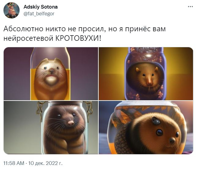 На фоне возросшей популярности нейросетей, обрабатывающих картинки в различных стилях, пользователи интернета также выложили «арты» на тему кротовухи. На большинстве из них кроты изображены живыми.