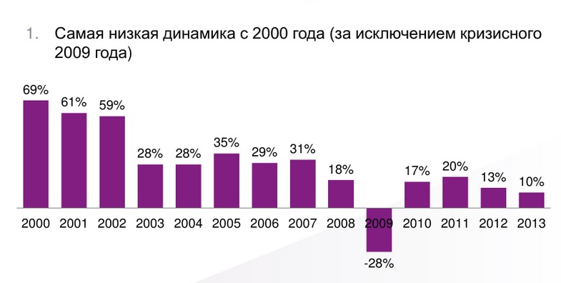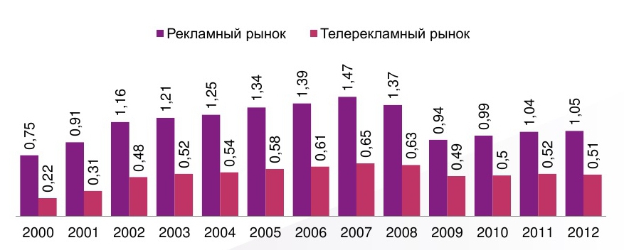 Динамика рекламного рынка России замедляется с 2011 года. По итогам 2013 года, согласно данным АКАР, рынок вырос на 10 %, достигнув объема в 328 млрд. рублей. Это самая низкая динамика с 2000 года, за исключением кризисного 2009 года, но одновременно одна из самых высоких в мире, отмечают в АЦ Vi.