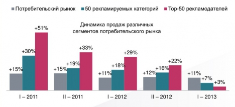 Крупнейшие рекламодатели из ТОП-50 по объемам рекламных бюджетов, снизив рекламную активность, ослабили позиции на рекламном рынке, что впервые за многие годы привело к сокращению их доли на потребительском рынке России в 2013 году.