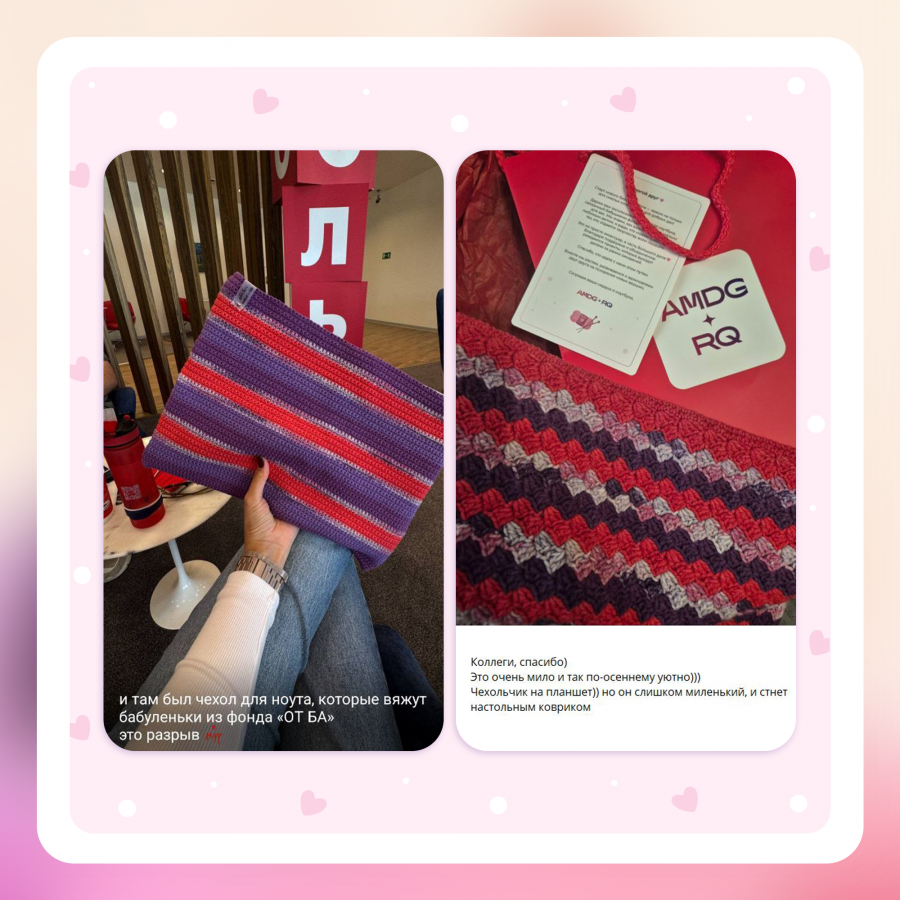 Тут как раз команда AMDG/RQ начала cентябрьский бизнес-сезон не с очередного мерча, а с человеческого жеста. Агентство решило создать ощущение тепла и заботы, которым оно окутывает своих клиентов. Поэтому во время похолоданий выбрали для коллаборации социальный проект «Это Ба»! Это фонд, где бабушки вяжут вещи вручную. В тандеме с вязальщицами они создали чехлы для ноутбуков.