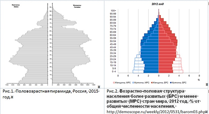 Одной из особенностей российского рынка является немонотонность демографической пирамиды (рис.1), отличающейся (рис.2) и от развитых стран (с доминированием трудоспособных возрастов и высокой долей пожилых) и от экономически отсталых (классическая пирамида: доминирование молодежи, низкая доля пожилых).