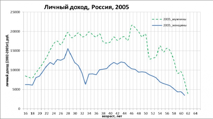 На 2005 год распределение доходов примерно соответствовало «стандартным» представлениям, хотя уже тогда удивляла заметная немотонность доходов от возраста, причем у женщин колебания были более выраженные. Но, следует признать, особого внимания это тогда не привлекло, а выраженное снижение доходов у женщин после 28 лет объяснили себе неполной занятостью женщин из семей с маленькими детьми.