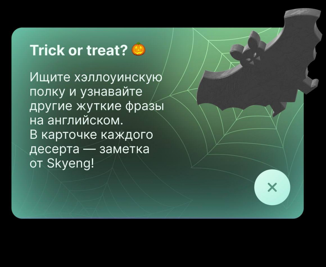 - Онлайн-школа английского языка Skyeng — к Хэллоуину выделили полку со сладостями Trick or treat?, к каждому товару на ней написали забавный образовательный текст на английском в тематике праздника. ЦА — молодежь и офисные сотрудники;