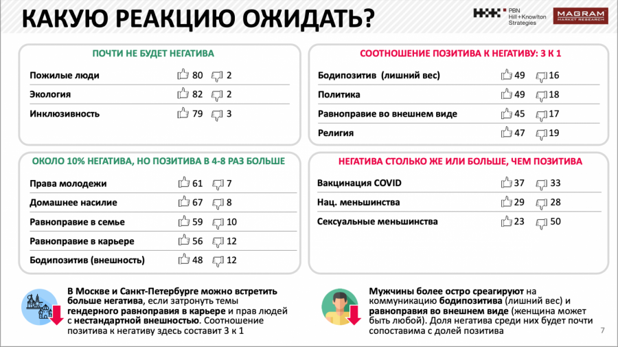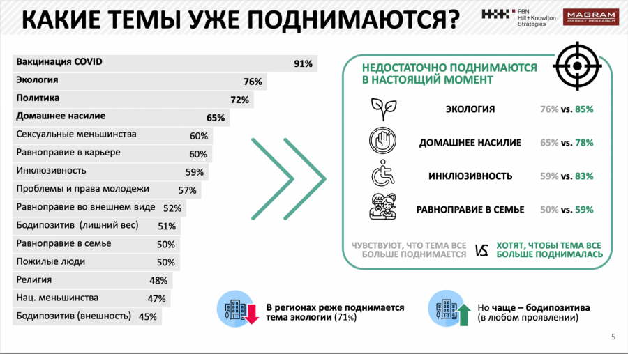 Каждый второй опрошенный (53%) категорически против обсуждения темы сексуальных меньшинств, а каждый третий или четвёртый — вакцинации от COVID-19 (30%), национальных меньшинств (29%), бодипозитива (27%), гендерного равноправия во внешнем виде (25%) или нестандартной внешности (24%). Девять из десяти респондентов (91%) считают, что сейчас самая распространённая тема социальной повестки — вакцинация от COVID-19.