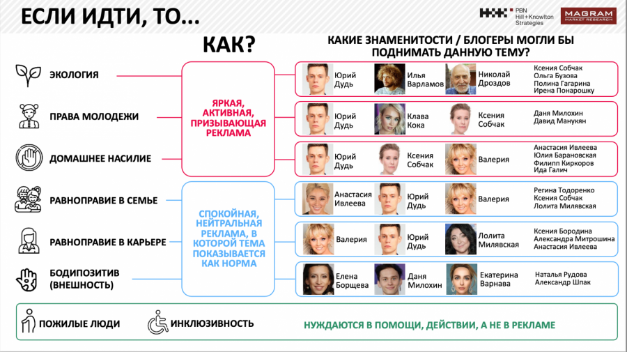 По мнению респондентов, при выборе знаменитости в качестве лица рекламной кампании больше всего важна естественность, амбассадор должен был ранее сталкиваться с этой темой или поднимать её в своей коммуникации. Чаще других для рекламных кампаний социальной повестки россияне видят блогера Юрия Дудя и певицу Валерию. С экологией у них ассоциируются Николай Дроздов и Илья Варламов, с темой прав молодёжи Клава Кока и Дава, равноправие в семье — с Настей Ивлеевой и Региной Тодоренко, тема бодипозитива — с Екатериной Варнавой и Еленой Борщёвой, тема равноправия в карьере — с Лолитой Милявской и Александрой Митрошиной.