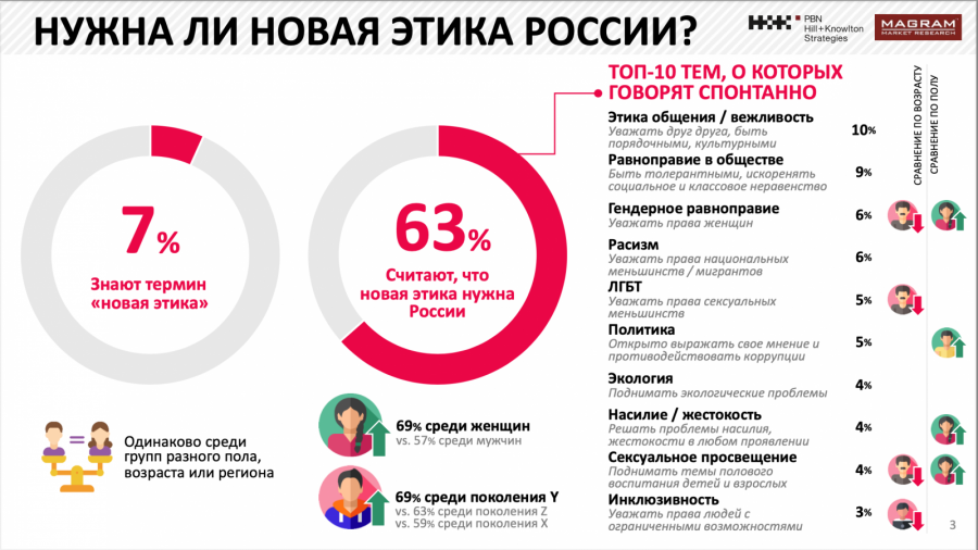 63% опрошенных считают, что России нужна новая этика. Основные темы, о которых респонденты хотят слышать в контексте новой этики: