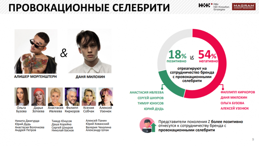 Каждый второй россиянин (54%) скорее негативно относится к сотрудничеству бренда с провокационными селебрити, к которым они относят Филиппа Киркорова, Даню Милохина, Ольгу Бузову или Элджея. При этом каждый пятый (18%) приветствует коллаборации с неоднозначо воспринимаемыми знаменитостями: Анастасией Ивлеевой, Сергеем Шнуровым, Тимати и Юрием Дудём.