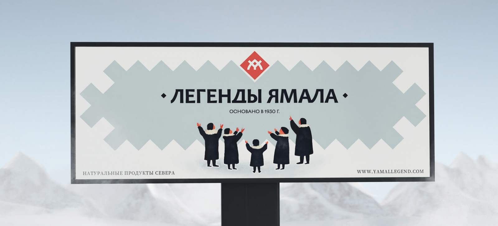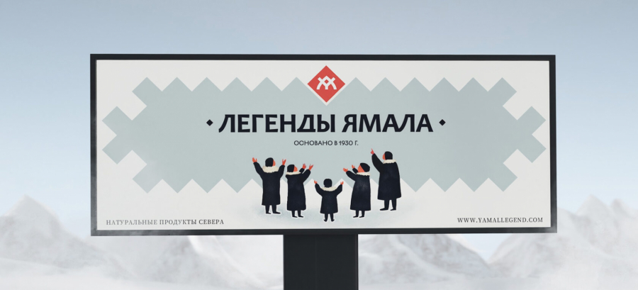 В качестве графической идеи команда взяла образ коренных народов. Группа ямальцев на иллюстрации — это и есть производитель продукта. Внимание жителей направлено на образ Крайнего Севера.
