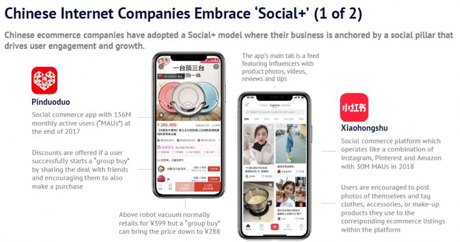 Китайские интернет-компании гиперсоциальны. Онлайн-ритейлеры успешно освоили модель Social+, которая обеспечивает им высокий уровень вовлеченности и стремительный рост. Например, платформа Xiaohongshu с 30 млн пользователей в месяц сочетает в себе функции Instagram, Pinterest и Amazon.