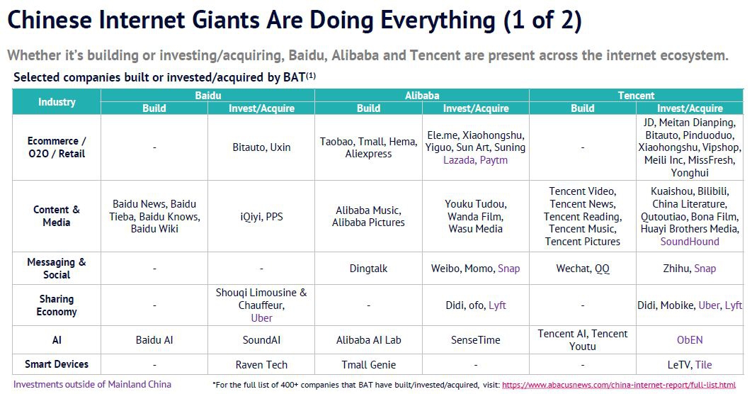 Азиатские интернет-гиганты занимаются всем. Baidu, Alibaba, Tencent представлены во всех сегментах онлайн-экосистемы — от стриминга видео до самоуправляемых автомобилей. Традиционный сценарий: инвестиции в стартапы или создание собственного бизнеса.