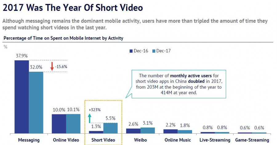 Азиатский рынок открыл нам мир приложений для коротких видео, бум которых можно наблюдать в Европе и США. Примерно 600 млн китайцев активно пользуются приложениями, которые позволяют снимать и размещать короткие видео. Это 80% от всех пользователей мобильного интернета в стране. В 2017 году время, проведенное китайцами за просмотром коротких видео, увеличилось в три раза.