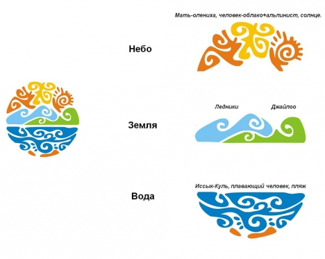 «Туристический логотип состоит из трех составляющих: небо - мать олениха, облако, человек, солнце; горы - ледники Кыргызстана, жайлоо, богатые зеленью; вода - Иссык-Куль - главный туристический объект Кыргызстана, плавающий человек - турист, пляж и следы на пляже», - рассказал автор проекта.