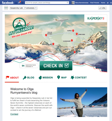 Интернет-агентство ДАЛЕЕ запустило международное Facebook-приложение, посвященное путешествию инструктора альпинистского клуба Ольги Румянцевой на семь высочайших вулканов мира при поддержке «Лаборатории Касперского».