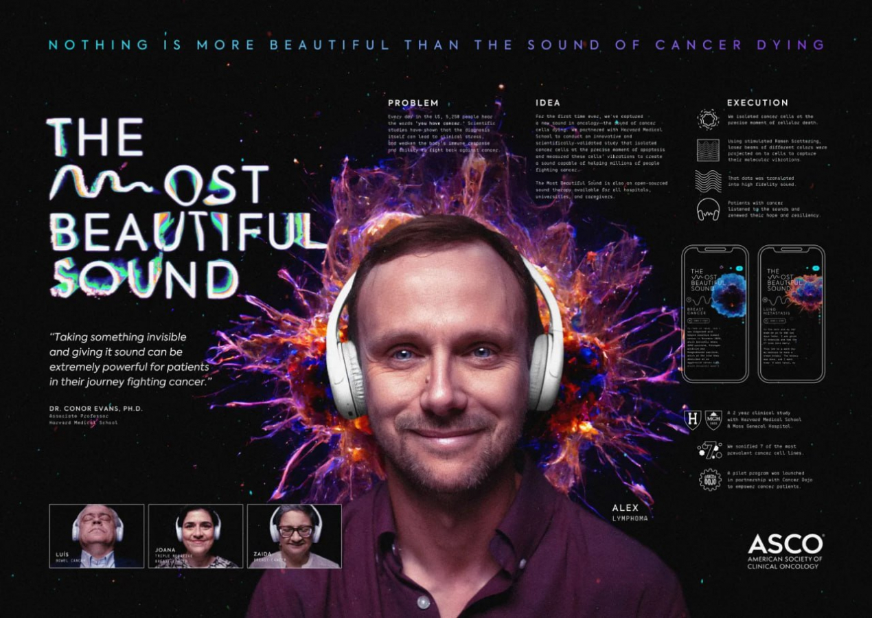 «Самый красивый звук» — это кампания дать больным раком больше понимания того, как лекарства могут напрямую воздействовать на раковые клетки. В сотрудничестве с исследователями из Гарвардской медицинской школы и Массачусетской больницы общего профиля команде авторов удалось изолировать клетки от различных видов рака в точный момент апоптоза (гибели клеток) и зафиксировать этот звук. Не это ли самый красивый звук, которого так ждут все пациенты?