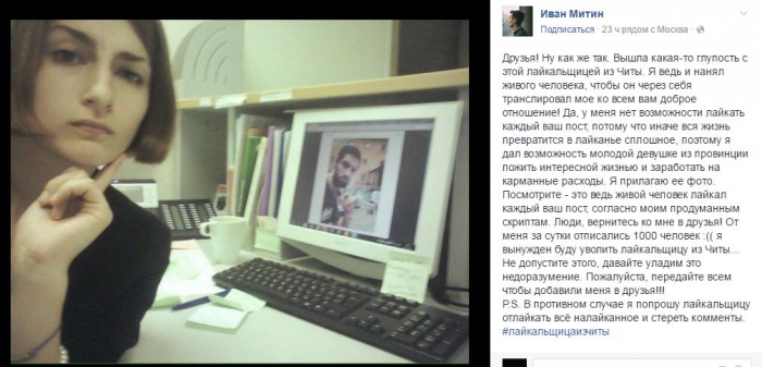 Несколько дней пользователи Facebook обсуждали «социальный эксперимент», который провел владелец сети антикафе «Циферблат» Иван Митин. Он рассказал, что нанял девушку для имитации активности в соцсетях. За 20 тысяч рублей «лайкальщица» из Читы ставила лайки друзьям Митина и оставляла комментарии под их постами. В реальности эксперимент оказался шуткой, но многие поверили признанию и отписались от автора.