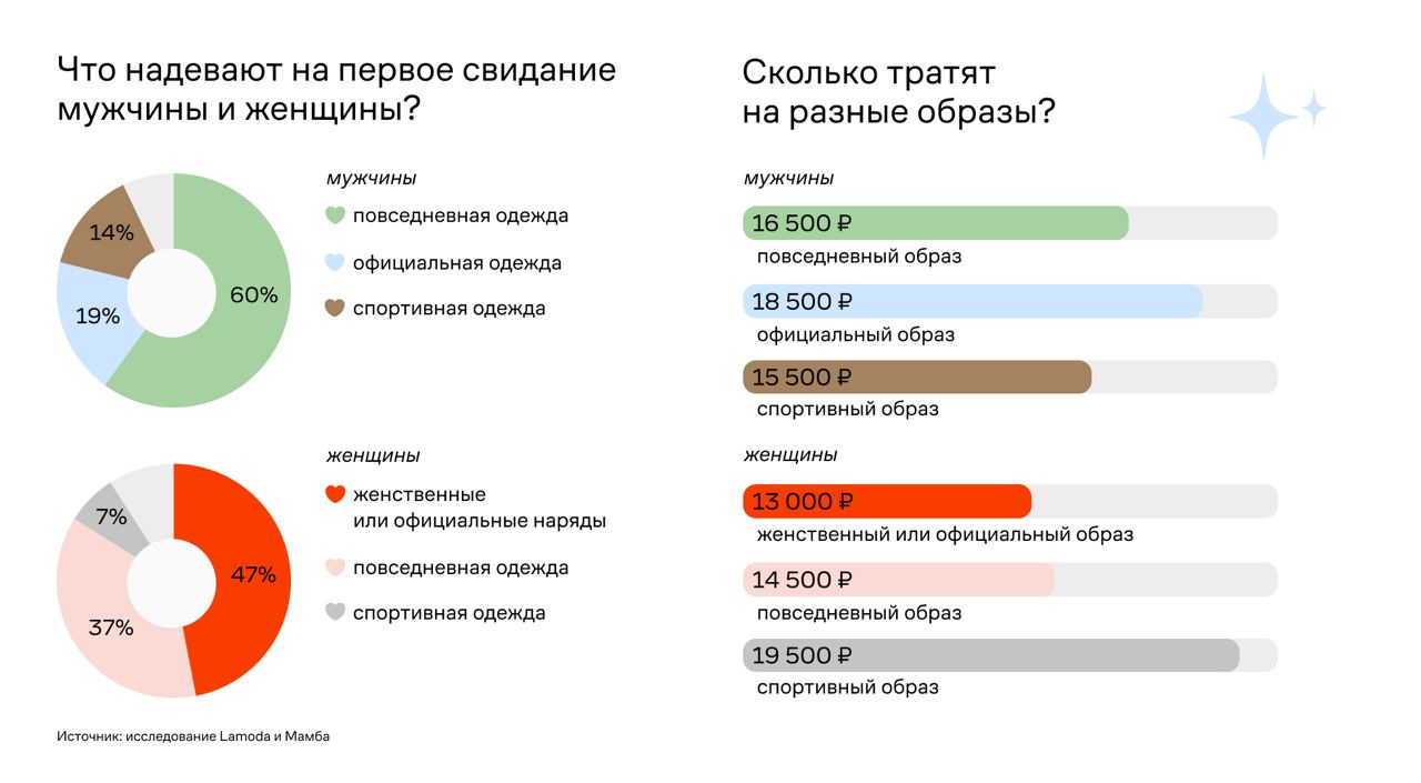 Маркетплейс Lamoda и приложение для знакомств Mamba выяснили, какую одежду предпочитают мужчины и женщины для первого свидания. Эксперты компаний опросили более 4 тыс. россиян, а также изучили потребительское поведение пользователей в декабре 2021 года — январе 2022. Подробнее о предпочтениях в одежде для свиданий — читайте в материале Sostav.