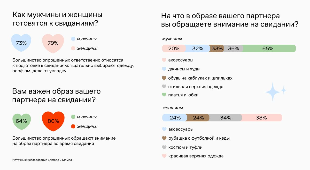Согласно данным опроса Lamoda и Мамба, более половины опрошенных мужчин обращает внимание на внешний вид своей спутницы. Чаще всего в женском образе мужчины выделяют платья и юбки (65%), стильную верхнюю одежду (36%), обувь на каблуках и шпильках (33%), джинсы и худи (32%). Лишь пятая часть опрошенных подмечают красивые аксессуары.