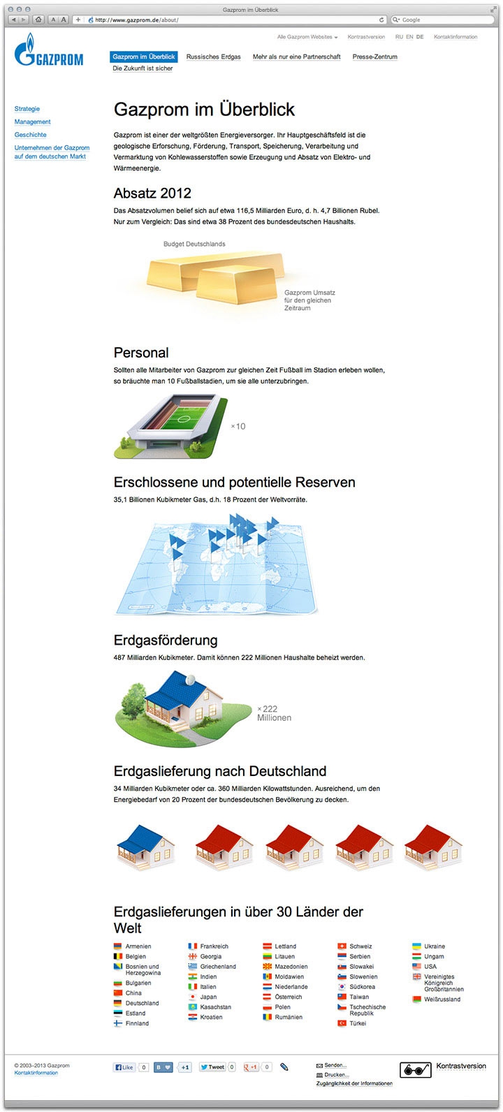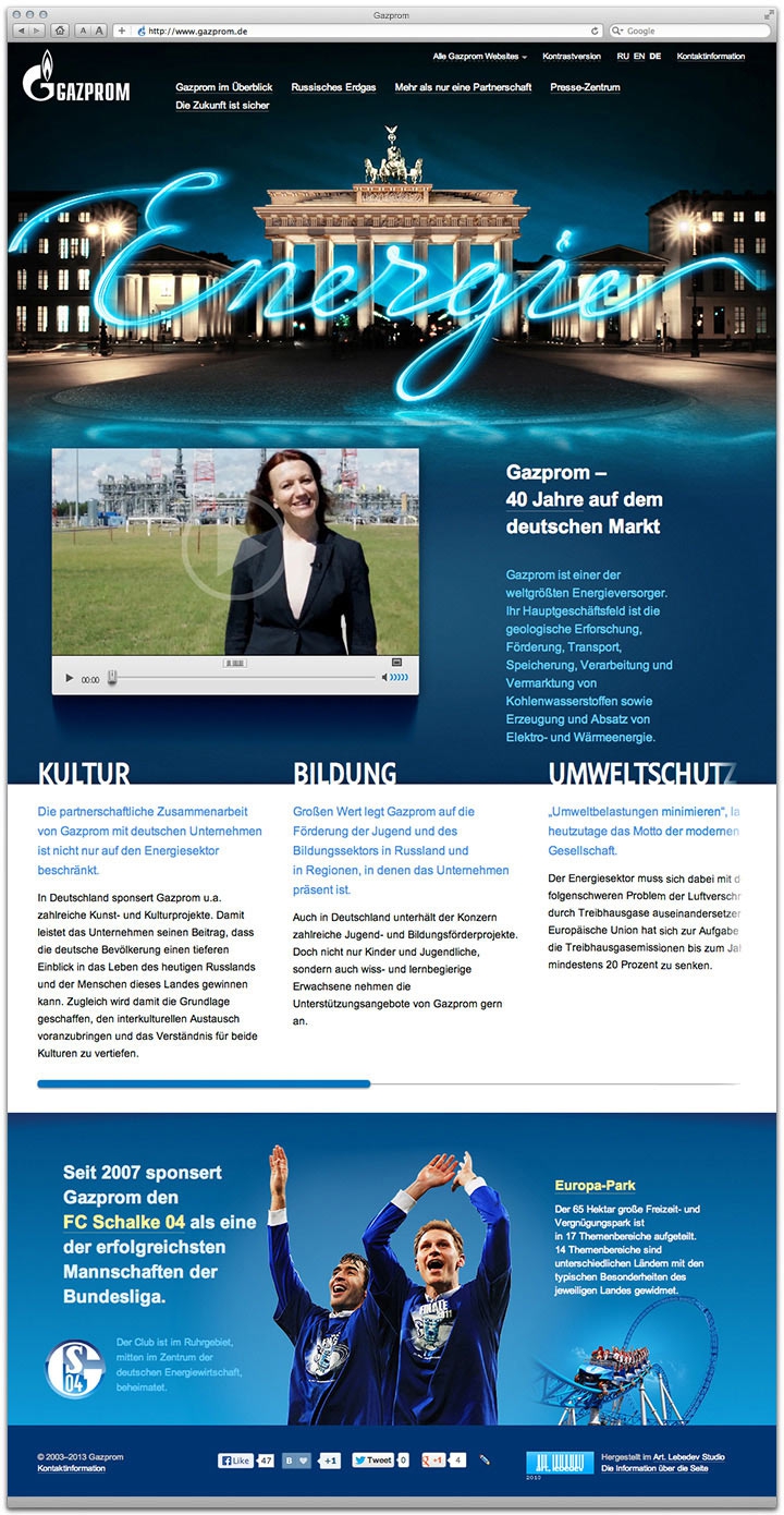 Студия Артемия Лебедева разработала немецкоязычную версию сайта «Газпрома» к 40-летию начала поставок газа в ФРГ.