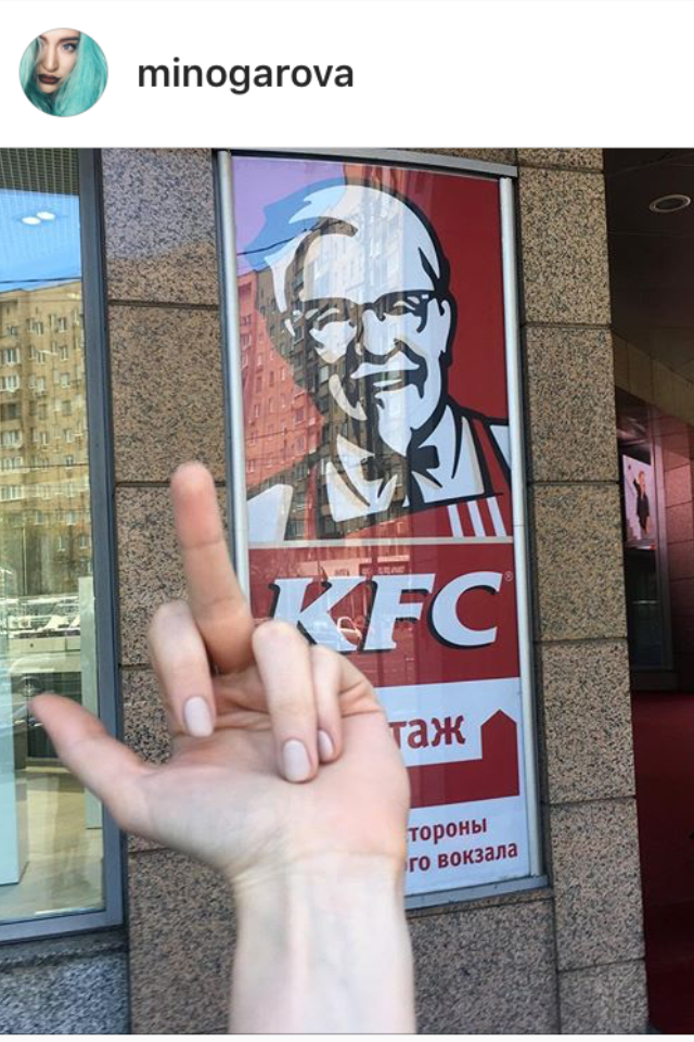 Телеведущая на своей странице в Instagram разместила фото своего среднего пальца на фоне рекламного стенда КFС. Девушку возмутило, что в меню ресторана все названия блюд в мужском роде и, соответственно, нет ни одного женского блюда. «Твистер, зингер, новинка у них „Шефбургер“! Это же все названия „мужские“! А мы? А я? Я уверенная в себе женщина, дайте мне женскую еду!» — написала модель в комментарии к посту.