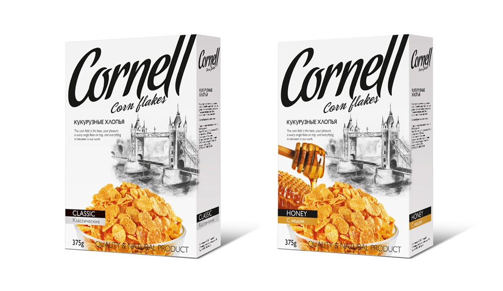 В соответствии с этим позиционированием бренда креаторы разработали громкое и в то же время теплое название - Cornell, сочетающее в себе корень Corn, который означает злак. Для логотипа же специалисты выбрали стильный и хорошо читающийся шрифт.