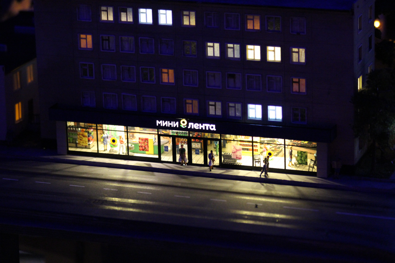 - «Cупер Ленту» воссоздали в столичной новостройке. Вход в супермаркет украшают воздушные шары, а рядом прогуливаются довольные покупатели.