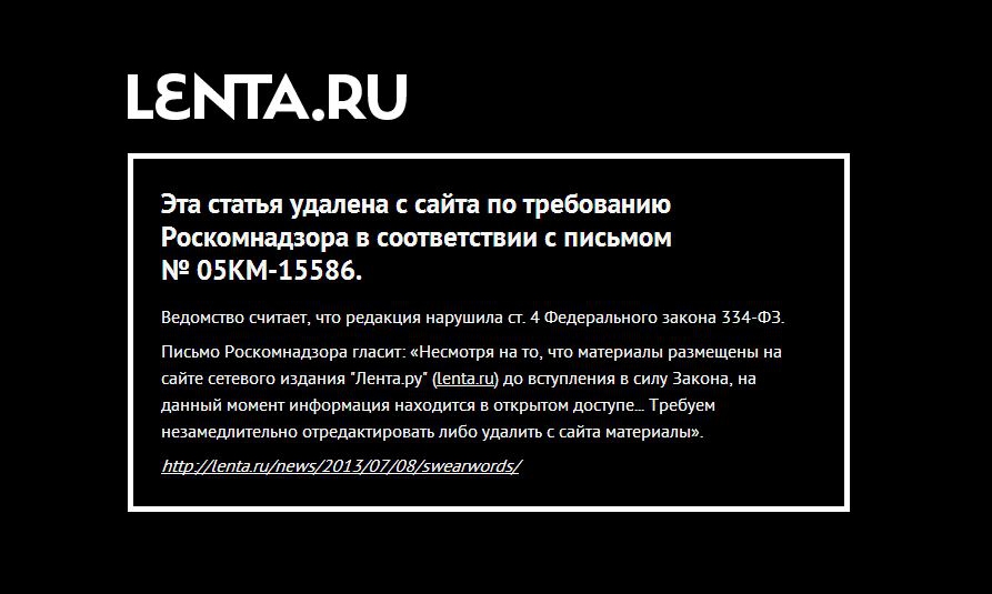 Роскомнадзор потребовал удалить или отредактировать материалы, «Лента.ру» выбрала первый вариант. При этом все эти материалы были опубликованы до вступления запрета на употребление нецензурной брани в СМИ. Информация находится в открытом доступе и поэтому нарушает закон, заявили в Роскомнадзоре.