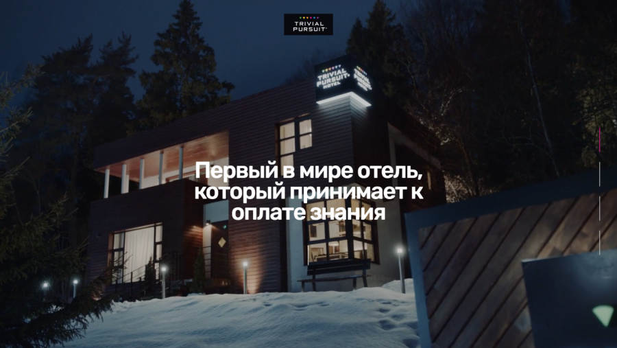 Trivial Pursuit — одна из самых популярных викторин в мире. Ее название в Америке стало таким же нарицательным, как у нас домино или шахматы. В России об этой игре не знает практически никто. Чтобы познакомить людей с Trivial Pursuit, компания Hasbro открывает одноименный отель в Подмосковье, где кэш и кредитка не имеют никакой ценности.