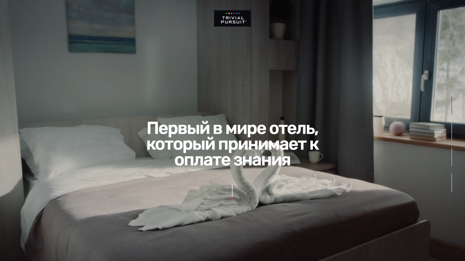Leo Burnett Moscow и Hasbro Gaming создали нестандартный проект для промотирования настольной игры-викторины Trivial Pursuit. Команда агентства и клиента решила воплотить игру в жизнь и создать уникальный отель по мотивам викторины. Отель, в котором постояльцам вообще не понадобятся деньги, а вот без эрудиции будет туго.