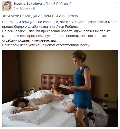О назначении Рябцевой на должность главы предвыборного штаба Ксения Соколова сообщила в своем Facebook. "Настоящим официально сообщаю, что с 16 августа начальником моего предвыборного штаба назначена Леся Рябцева. Не сомневаюсь, что эта прекрасная новость вдохновляет не только меня, но и всю прогрессивную общественность, обеспокоенную судьбами родины и человечества", - говорится в посте