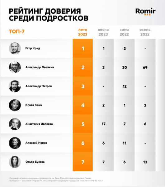 Весной он также возглавлял рейтинг. Вторую строчку в топ-7 этим летом занял хоккеист Александр Овечкин, поднявшийся на одну позицию с весны. Третье место у актёра театра и кино Александра Петрова, который ранее выбыл из рейтинга. На четвёртой строчке — певица Клава Кока.