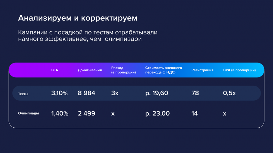 Кампании с посадкой по тестам отрабатывали намного эффективнее, чем с олимпиадой. Из 24 публикаций система определила две самые эффективные и автоматически отдавала им приоритет в показах. Они и принесли основной объём конверсий: 145 регистраций из 200.