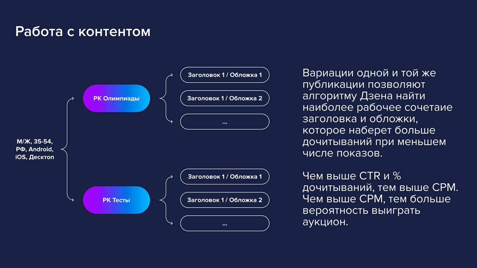 Получив первые результаты, мы увидели, что прогнозируемой ставки недостаточно, чтобы реализовать весь тестовый бюджет. На основании этого мы расширили возраст с 35−54 лет до 25−54 лет и увеличили ставку. Ещё захватили все регионы России, а также мобильные и ПК-устройства. Таргетинги по интересам не настраивали, поскольку в «Дзене» их нет.
