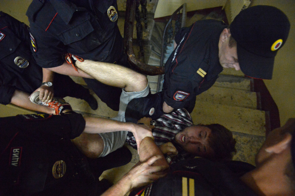 Полиция более пяти часов пыталась проникнуть в квартиру. После того, как стражам порядка все же удалось взломать дверь, были задержаны: Олег Козловский, Роман Переверзев, Кирилл Андреев и Василий Дровецкий. Их обвинили в неповиновении полиции.