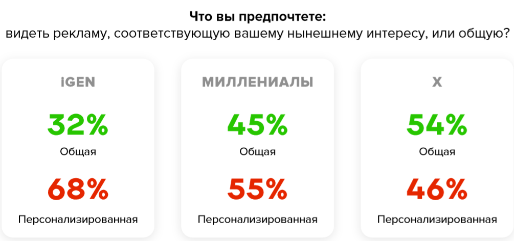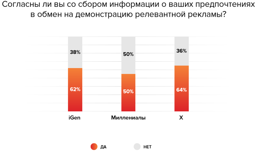 Больше половины представителей старшего поколения выбрали общую рекламу. И чем младше опросная группа, тем больше они согласны видеть персонализированную рекламу. Мы связываем это с опытом поколений. Если старшее поколение еще помнит время «ковровых бомбардировок» рекламными сообщениями общего толка, то молодежь видит перед собой только релевантную рекламу.
