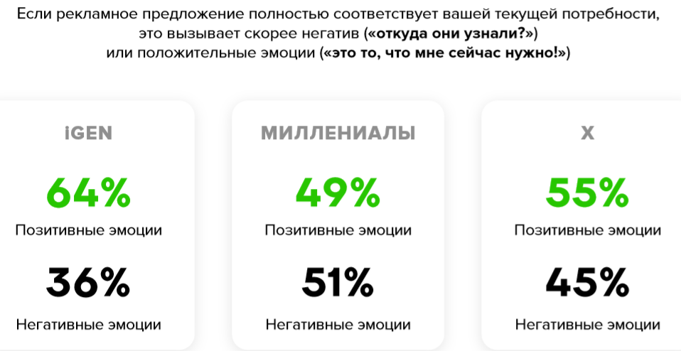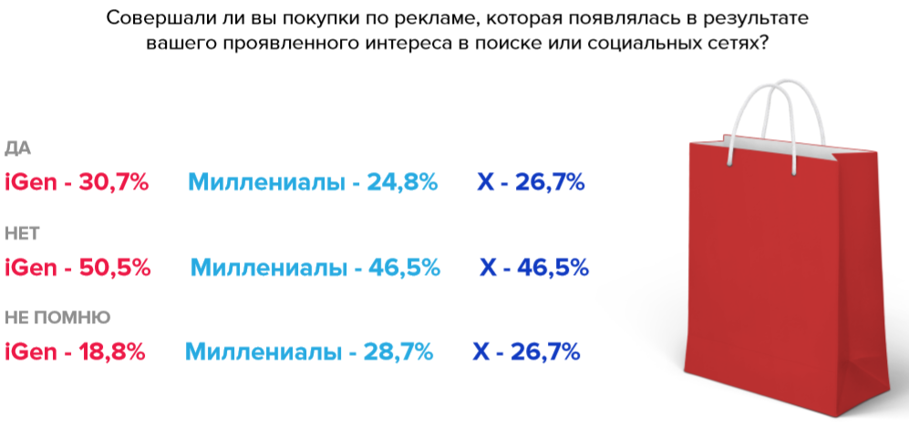 - Поколения по-разному относятся к таргетированной рекламе. Чем моложе, тем лояльнее.