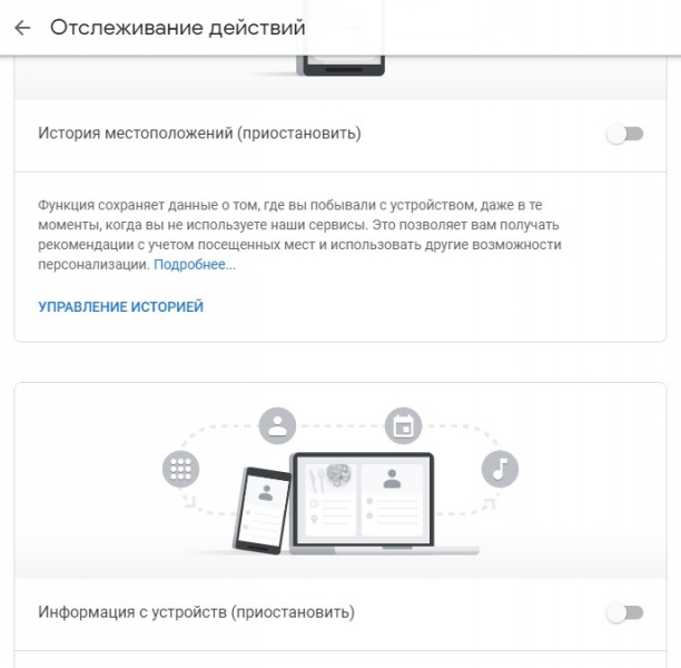 Google тоже дает некоторые возможности для управления своим аккаунтом и процессом сбора информации. Например, вы можете приостановить сбор местоположений, сведения о контактах, календарях, приложениях и другом контенте с ваших устройств. Сделать это можно в настройках аккаунта.