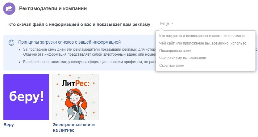 Еще одна «фишка» Facebook заключается в том, что каждый пользователь может посмотреть, какие компании загрузили списки с информацией о нем в рекламный кабинет или наоборот скачали информацию с платформы.
