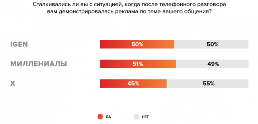 - Возможно рекламные площадки в сборе информации о пользователях заходят слишком далеко и прослушивают телефонные разговоры. Половина респондентов замечают это. И только у старшего поколения этот факт не вызывает удивления.