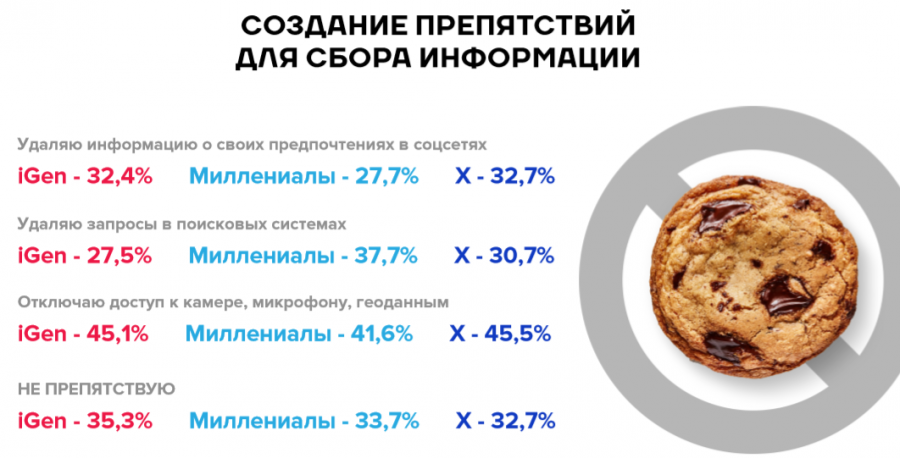 Две трети респондентов всех возрастов сказали, что удаляют информацию о своих запросах в поисковике, о своих предпочтениях в соцсетях и блокируют доступы на смартфонах к камере, микрофону, геоданным.