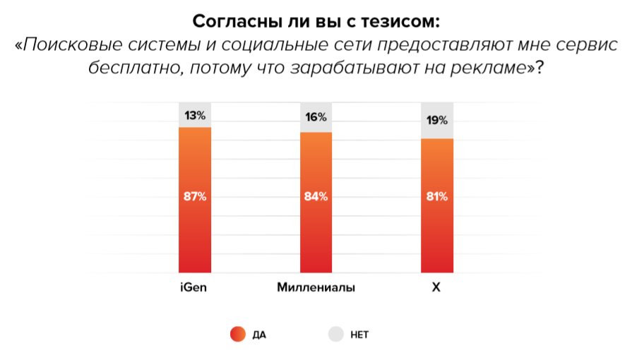 В целом пользователи всех поколений понимают, что социальные сети и поисковые системы предоставляют сервис бесплатно, потому что живут за счет рекламы. Мы не можем проследить динамику, насколько вырос этот показатель за последние годы, но уверены, что динамика у него есть. Связана она с тем, что появляются платные сервисы, которые делают акцент на отсутствие рекламы (YouTube, Amediateka