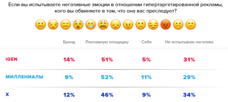 Логично было бы предположить, что все, кто согласился с получением релевантной рекламы, будут испытывать положительные эмоции при ее виде. Но нет! Среди них есть довольно значительная доля тех (треть), кто испытывает негативные эмоции.