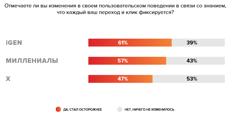 Наверное, именно поэтому старшее поколение на вопрос «Отмечаете ли вы изменения в своем пользовательском поведении в связи со знанием, что каждый ваш переход и клик фиксируется?» в большинстве своем ответило: нет. К чему все эти напрасные усилия? Также мы не исключаем, что их пользовательский опыт более продолжительный и менять привычки уже трудно. Причина еще может крыться в том, что пользователи засыпаны большим количеством информации. И зачастую нет времени на размышления о том, почему была показана та или иная реклама.