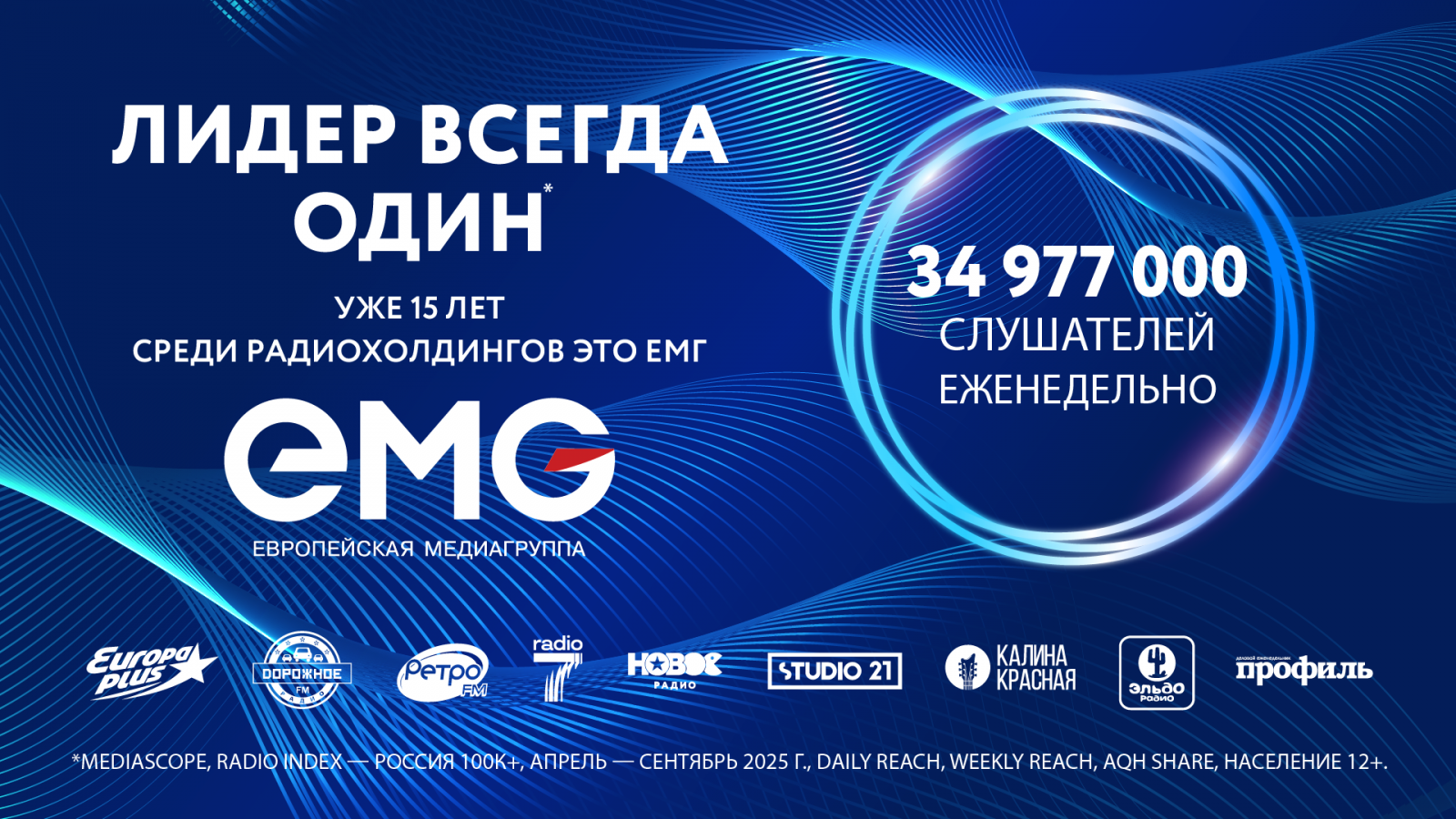«Европейская медиагруппа» более 15 лет уверенно занимает позицию лидера российской радиоиндустрии*. Согласно опубликованным в ноябре 2025 года данным рейтингов компании Mediascope, каждый день форматы ЕМГ выбирают 17,3 млн слушателей. Еженедельная аудитория холдинга — 35 млн человек, что превышает половину населения крупных городов России в возрасте 12+. Доля рынка холдинга по аудитории — 22,4%**.