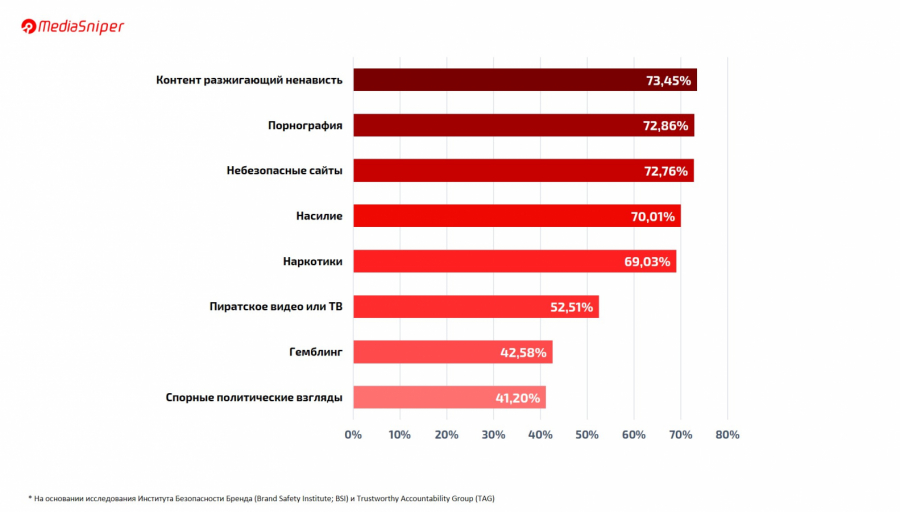 Недавно эксперты Института Безопасности Бренда (Brand Safety Institute; BSI) и Trustworthy Accountability Group (TAG) изучили то, каким образом размещения в разных категориях небезопасного контента влияют на потребительское поведение.