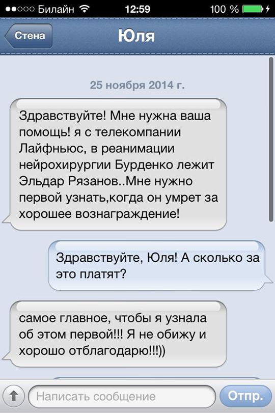 Методы сбора информации в холдинге News Media вновь стали предметом оживленных дискуссий. На этот раз издание LifeNews оказалось в центре скандала из-за переписки с предполагаемым ньюсмейкером. Журналистка «телекомпании» Юлия Иванова обратилась к сотруднику Научного Центра Неврологии РАМН Алексею Кащееву и попросила помочь - сообщить, когда кинорежиссер Эльдар Рязанов «умрет за хорошее вознаграждение!» (пунктуация автора - Sostav.ru).