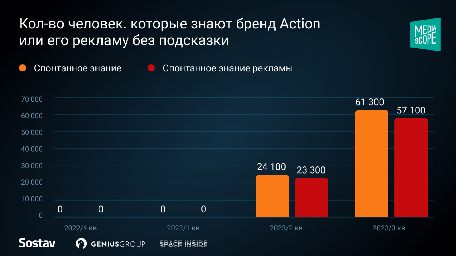 Программатик-реклама способствовала росту узнаваемости продукта, в рамках общего медиамикса были достигнуты все медийные показатели, и перевыполнен их план. По данным MediaScope, до второго квартала 2023 года не было отмечено значимого количества респондентов, которые были знакомы с брендом Action или видели его рекламу. Прирост знания отмечен следующим изменением показателей: спонтанное знание бренда выросло почти в три раза — с 24,1 тыс. до 61,3 тыс. человек, спонтанное знание рекламы лимонада увеличилось более чем в два раза — с 23,3 тыс. до 57,1 тыс. (Источник: MediaScope, BrandPulse, онлайн-опрос россиян от 14 до 64 лет, выборка в ПФО 9 тыс. человек).