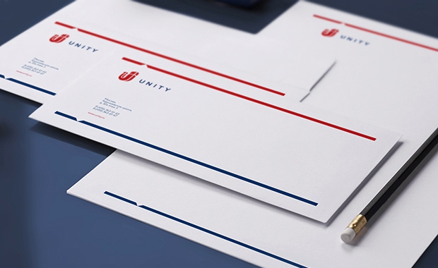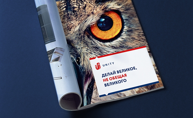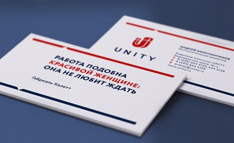 В основу новой визуальной концепции бренда UNITY легла идея магнита, как символа эффективного поиска. Разработанную концепцию фирменного стиля поддерживает логотип, выполненный в виде буквы U, визуально схожей с магнитом. С помощью красно-синей цветовой палитры формируется яркий, лидерский образ компании.